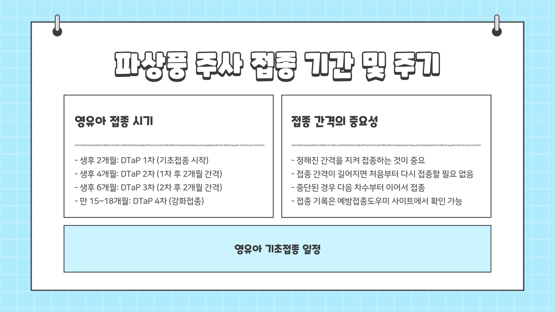 | 생후 4개월 | DTaP 2차 | 4개월 | 1차 후 2개월 간격 |