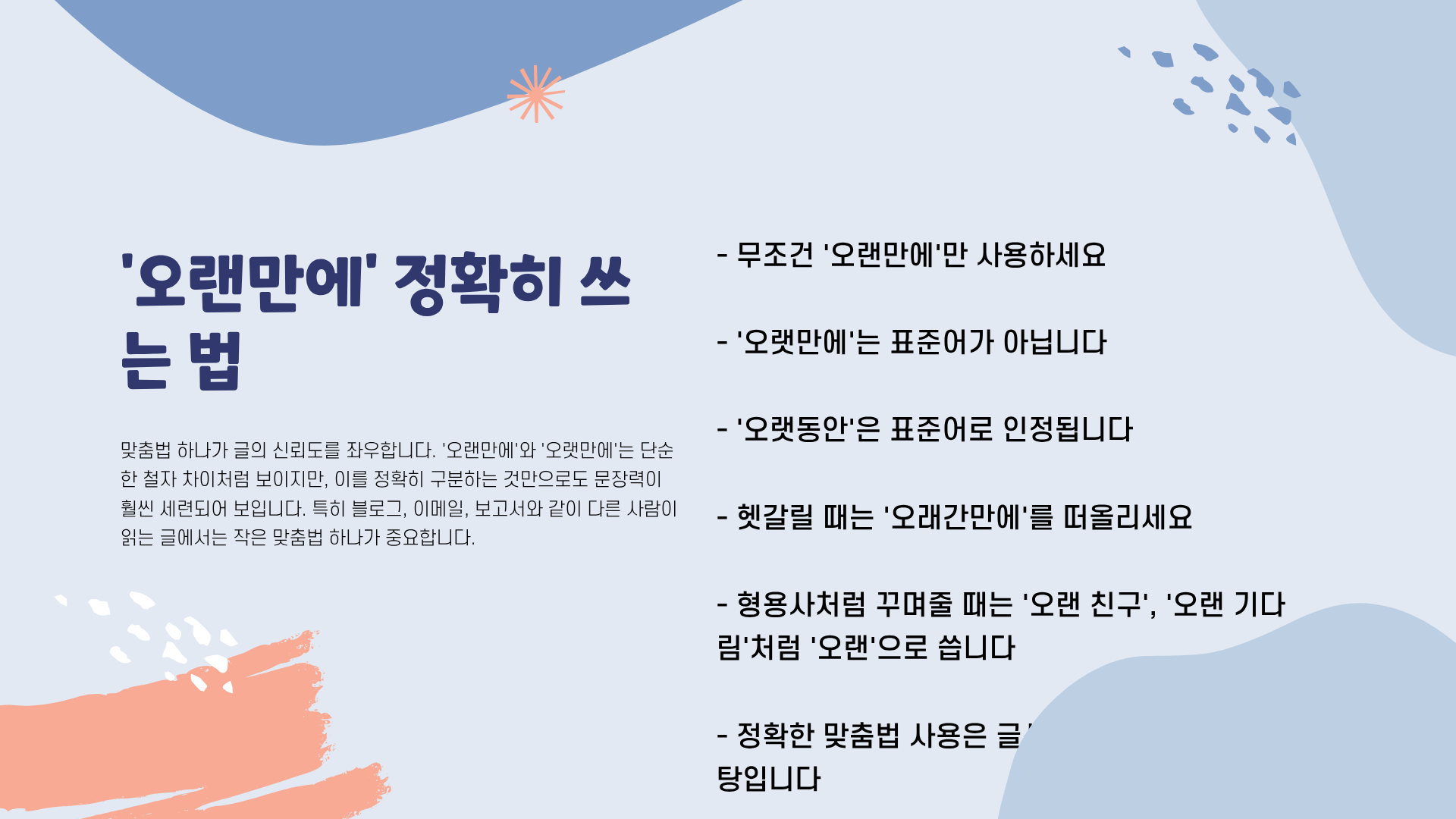 즉, ‘오래간만에’ → ‘오랜만에’로 줄여 쓰는 것이 자연스러운 형태다.