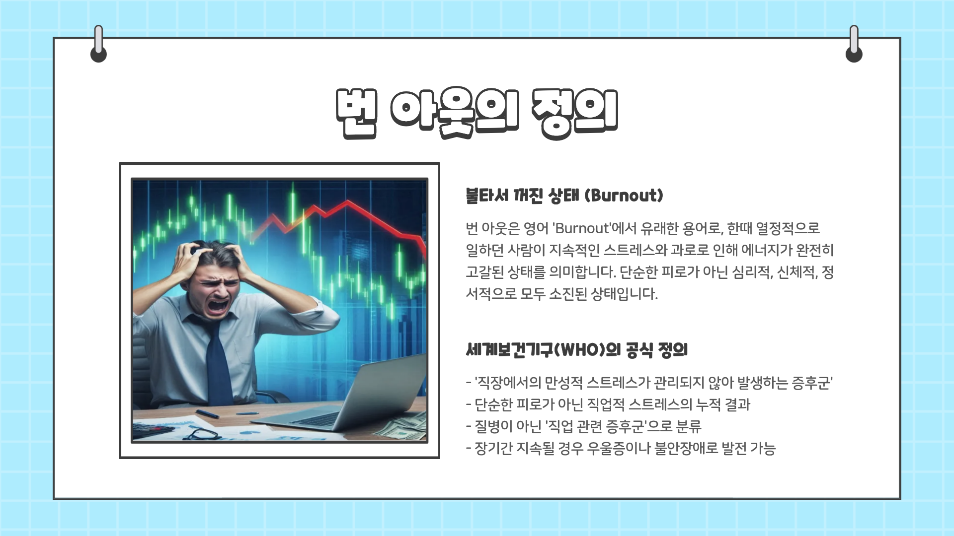 많은 사람들이 단순히 “지친 상태” 정도로 생각하지만, 실제로 번 아웃은 **세계보건기구(WHO)**에서 공식적으로 인정한 직업 관련 증후군이다.