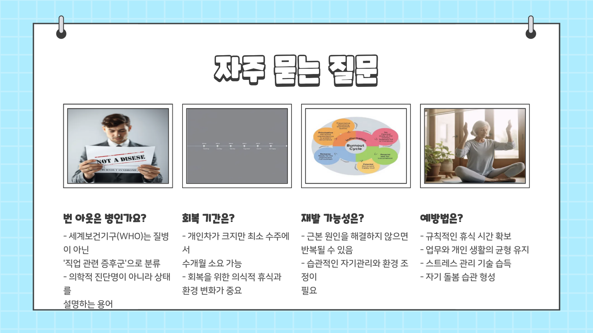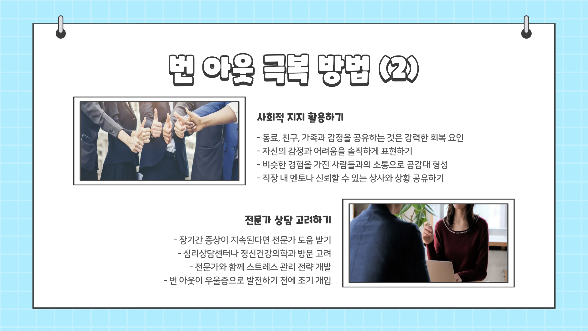 | 주요 원인 | 과중한 업무, 성취 압박, 통제감 상실, 사회적 지지 부족 |