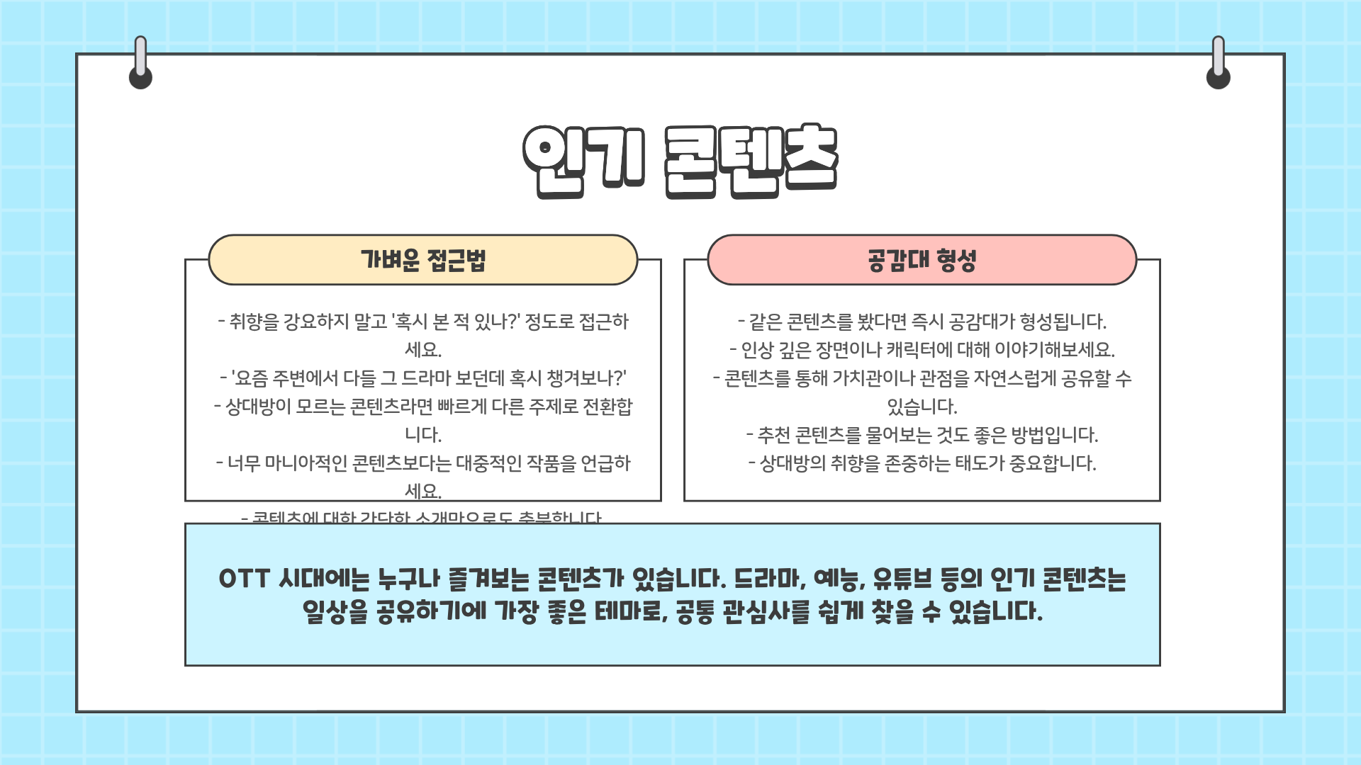 - 취향을 강요하지 말고 “혹시 본 적 있나?” 정도의 가벼운 접근이 좋다.