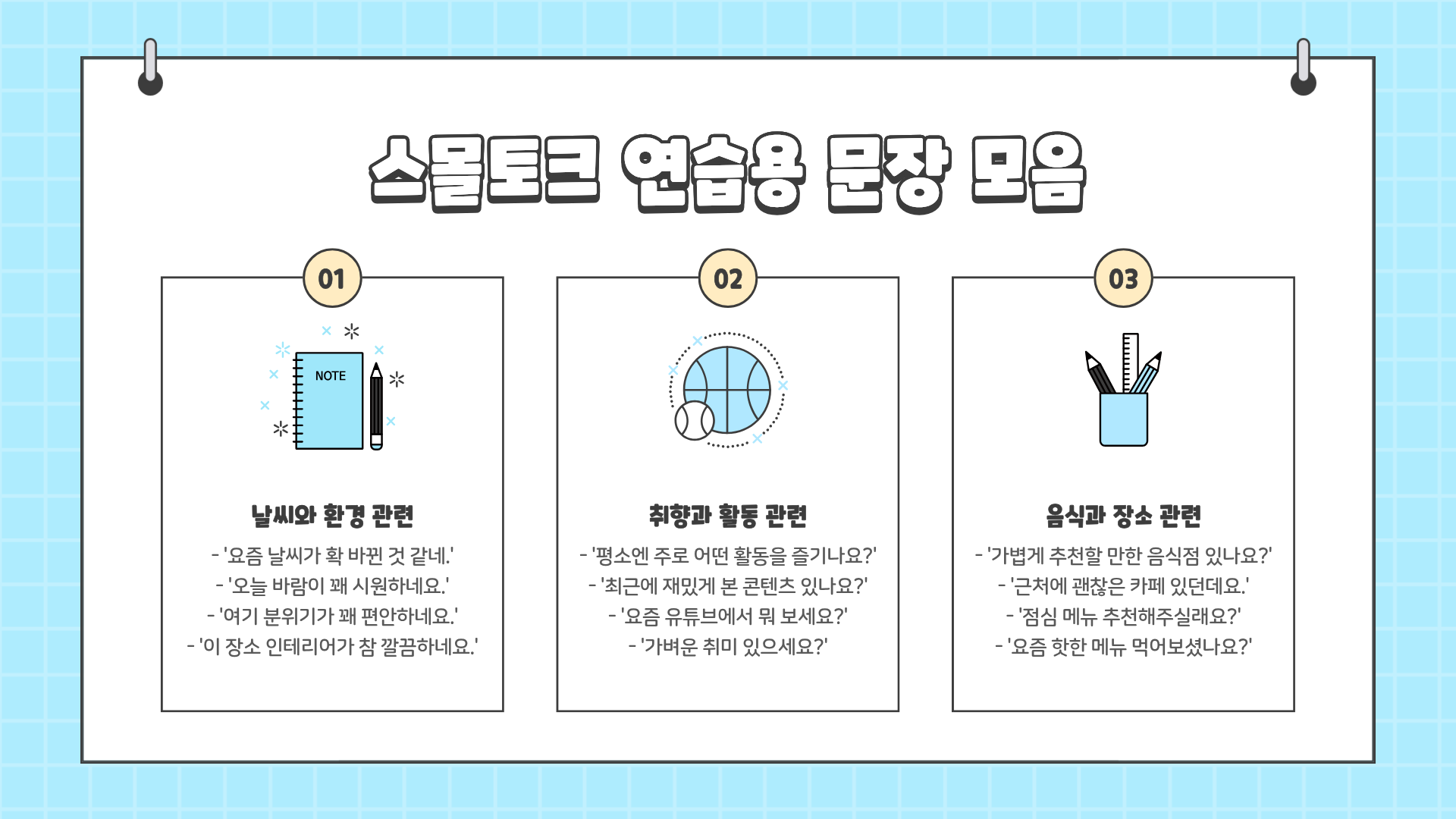 스몰토크 주제 연습용 문장 모음 (바로 써도 되는 문장)