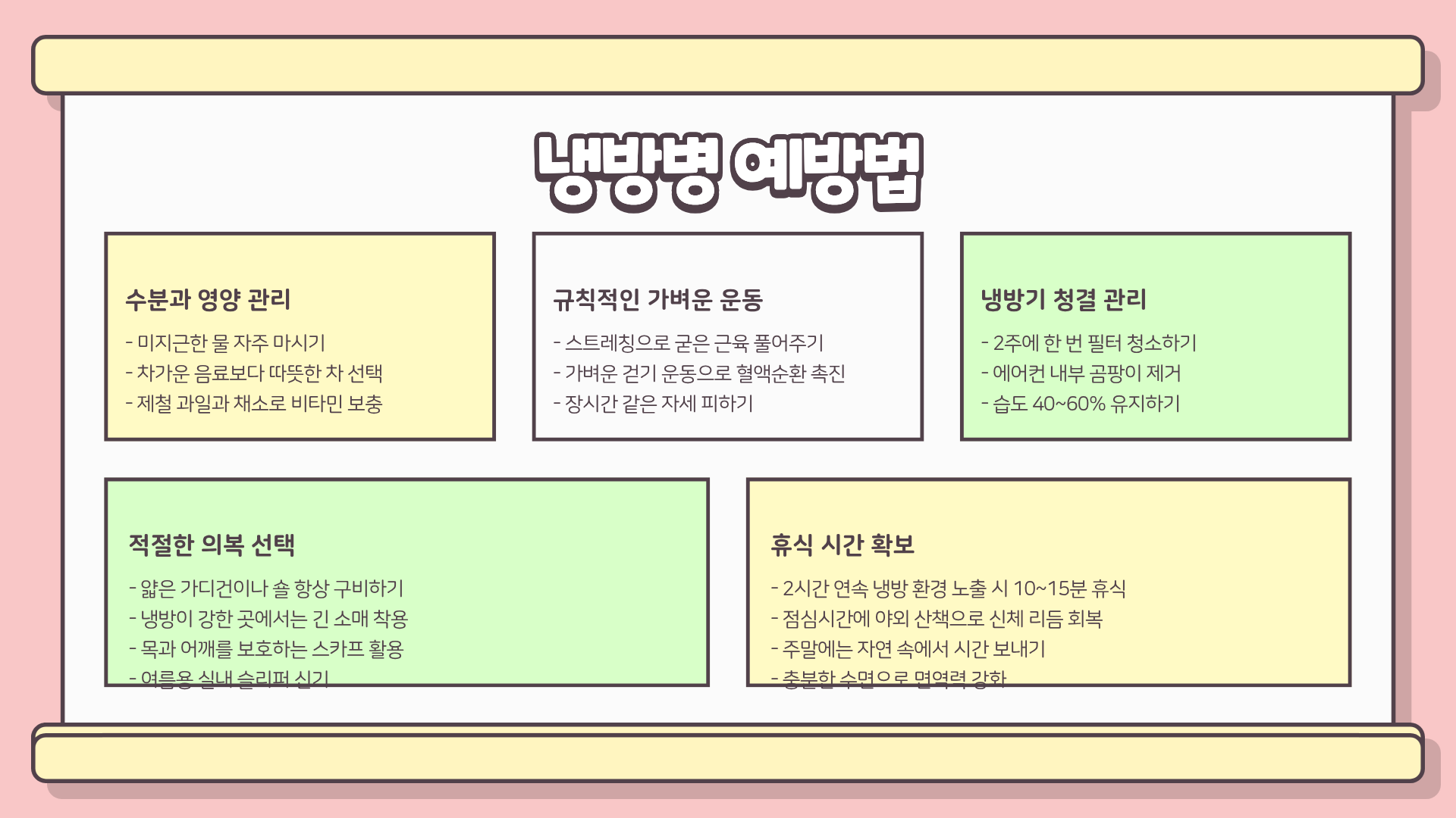 냉방병 증상을 초기에 알아차리고, 적당한 온도 유지·건강한 생활 패턴·따뜻한 음식 등을 활용하면 충분히 관리할 수 있다.