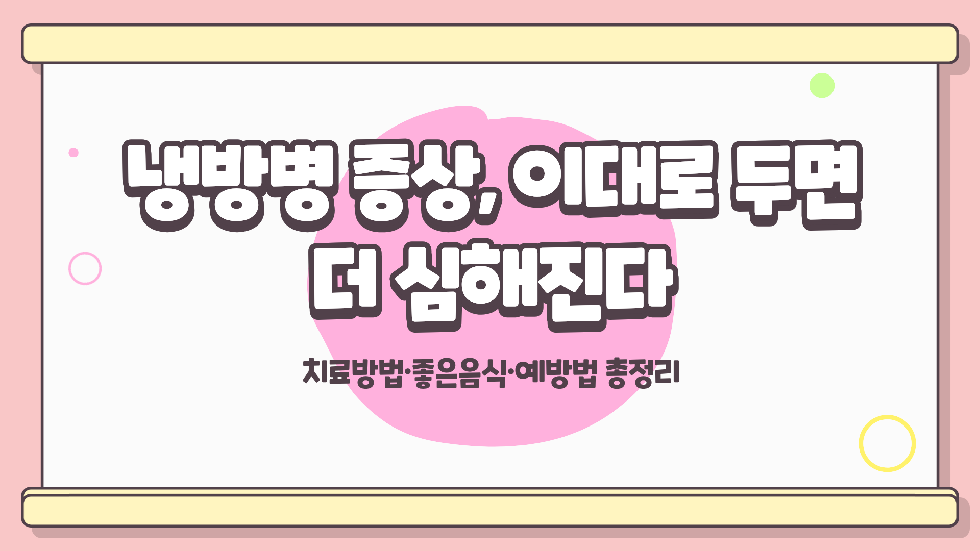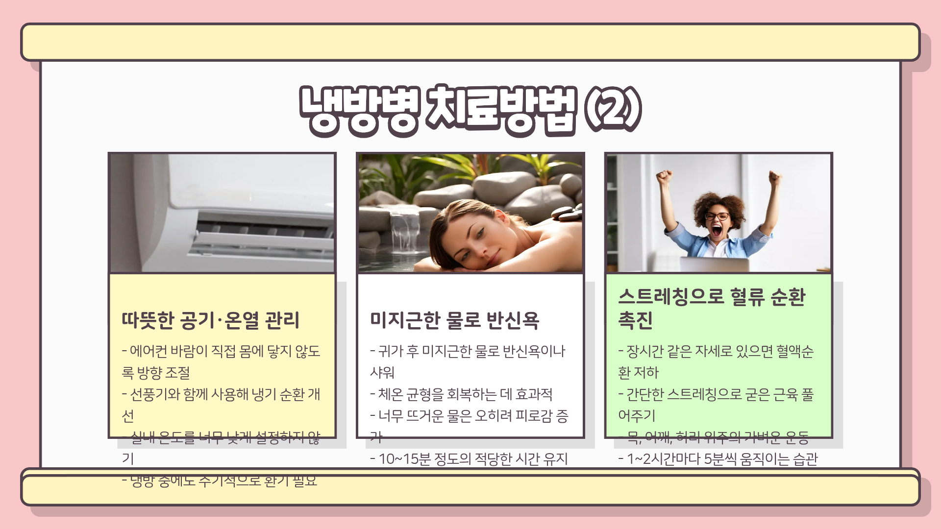 특히 냉방병 치료방법, 냉방병 좋은음식, 냉방병 예방법은 서로 연결되어 있어, 실천할수록 효과가 배가된다.