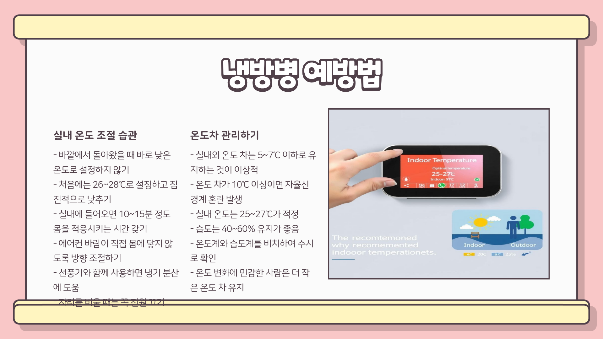- 실내외 온도 차는 5~7℃ 정도가 적당하다