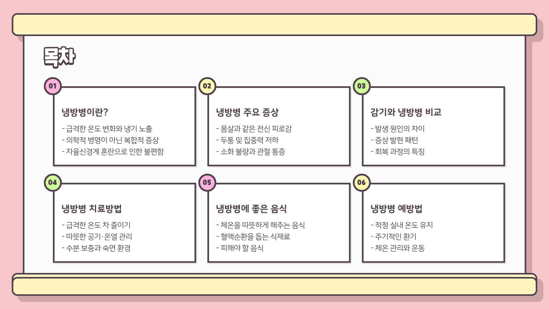 | 냉방병 | 냉기 노출·온도 차 | 몸살·두통·복부 냉증 |