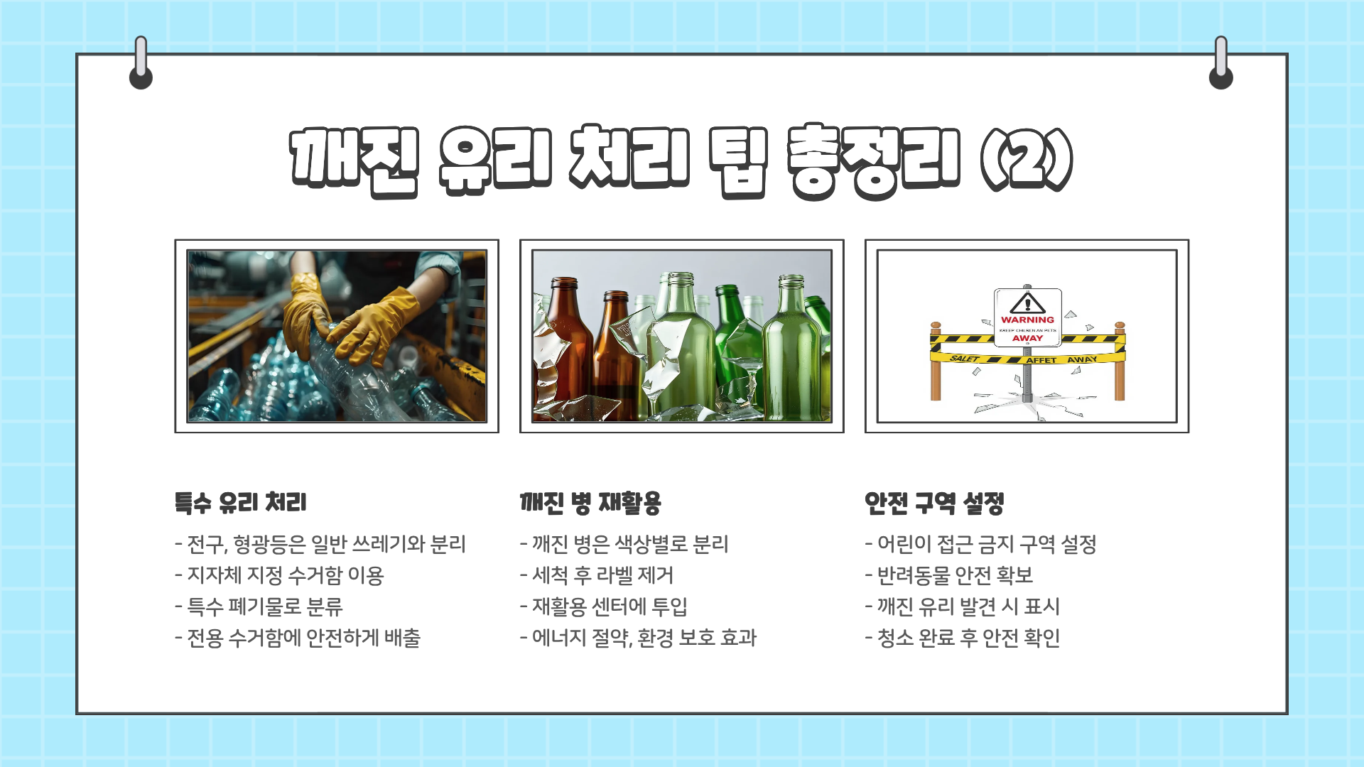 - 신문지/테이프 사용: 유리 조각을 감싸 안전하게 배출